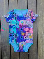 Our bodysuits can be made with different length sleeves so please send us a message if you would like something different from what is listed. Please note that pattern placement will be different and unique in each bodysuit. The crotch is closed with snaps for easy nappy changes and high quality ribbing is used for the cuffs/leg/neck bands. Currently made to order with a 2-3 week turnaround.