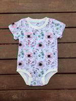 This bodysuit is lovingly made from cotton lycra Fabric which has been digitally printed. Our bodysuits can be made with different length sleeves so please send us a message if you would like something different from what is listed. Please note that pattern placement will be different and unique in each bodysuit. The crotch is closed with snaps for easy nappy changes and high quality ribbing is used for the cuffs/leg/neck bands. Currently INSTOCK.