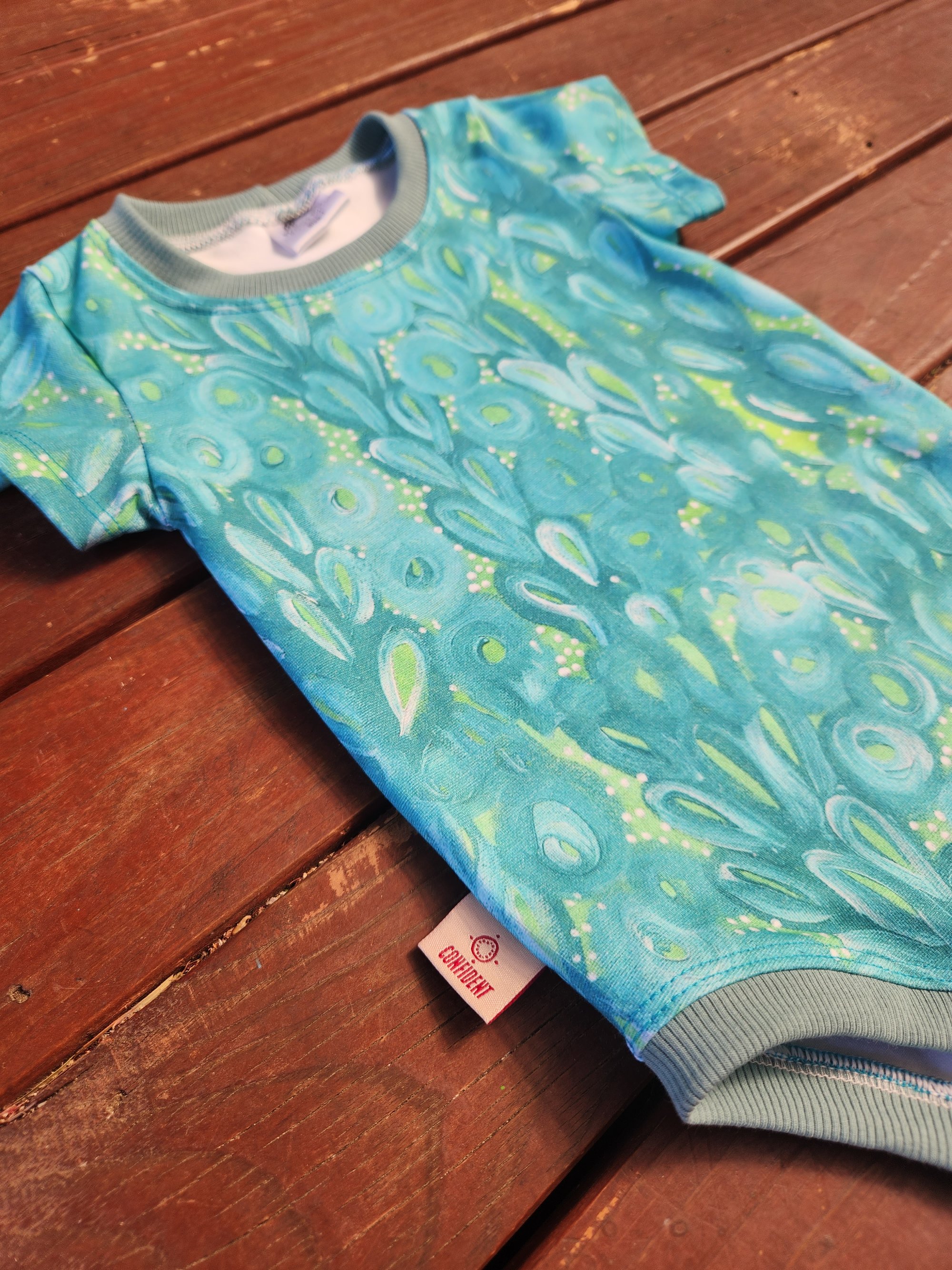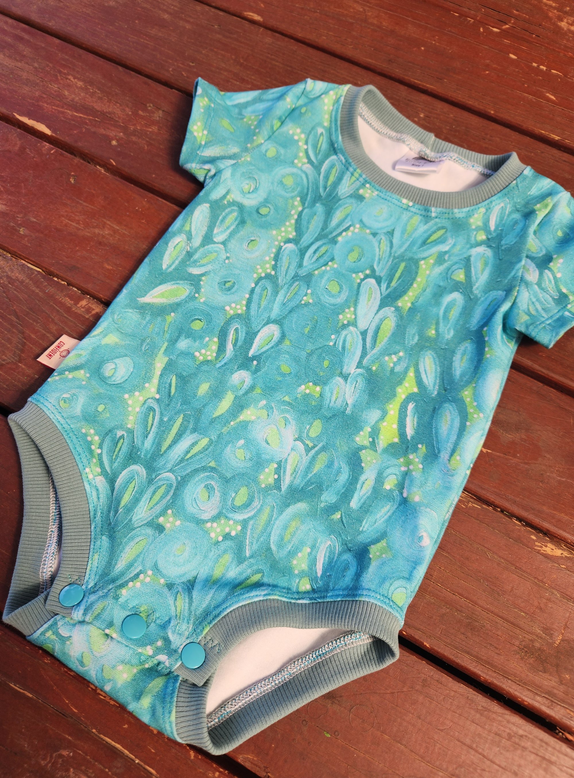 Our bodysuits can be made with different length sleeves so please send us a message if you would like something different from what is listed. Please note that pattern placement will be different and unique in each bodysuit. The crotch is closed with snaps for easy nappy changes and high quality ribbing is used for the cuffs/leg/neck bands. Currently made to order with 2-3 week turn around.