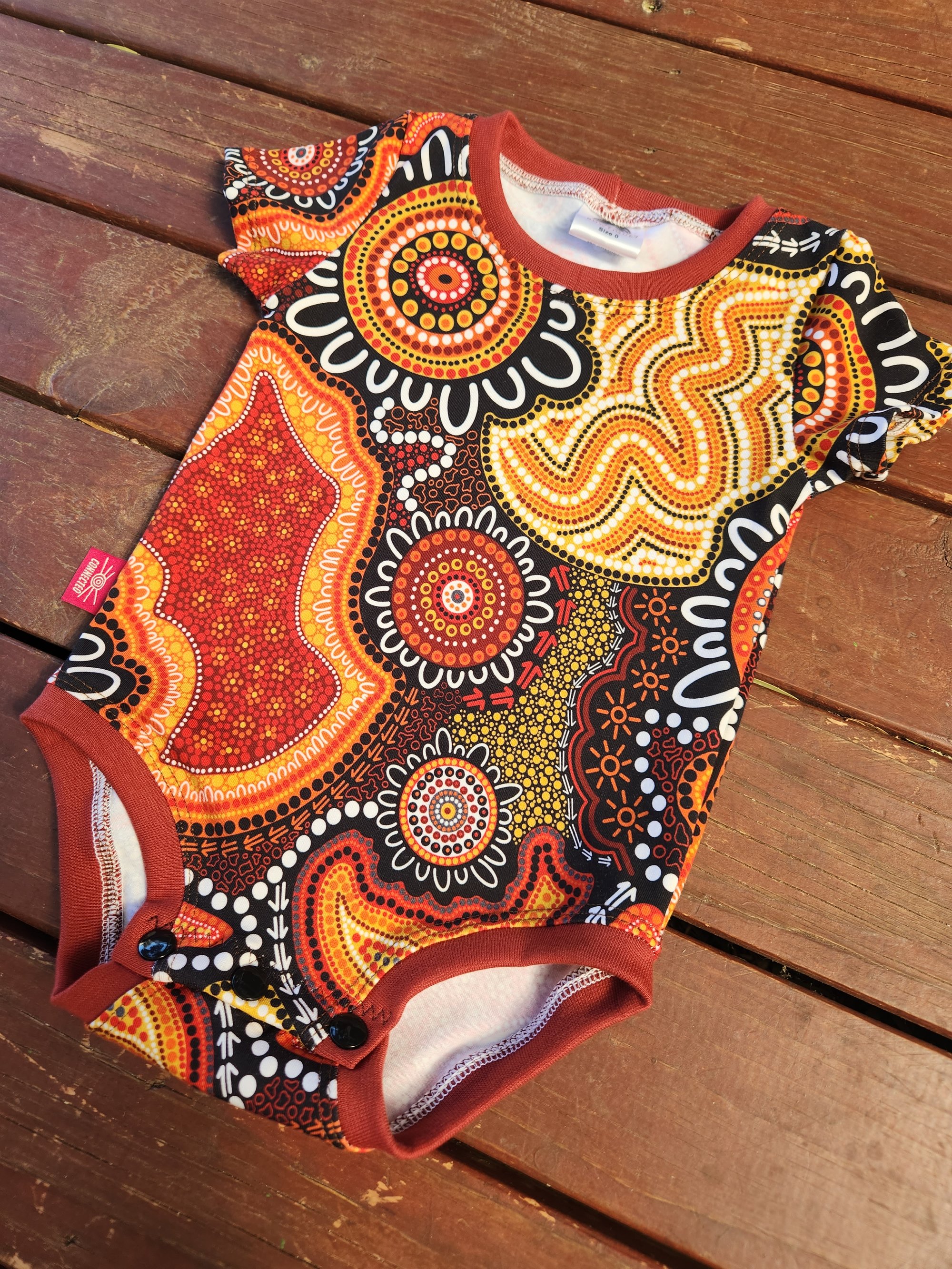 This bodysuit is lovingly made from cotton lycra fabric which has been digitally printed. The digital artwork is from Brooke Perry Indigenous Art. Brooke is a proud Wiradjuri woman and Indigenous artist from Jinibarra Country, Mount Kilcoy QLD. Our bodysuits can be made with different length sleeves so please send us a message if you would like something different from what is listed. Please note that pattern placement will be different and unique in each bodysuit. The crotch is closed with snaps for easy nappy changes and high quality ribbing is used for the cuffs/leg/neck bands. Currently made to order in 2-3 weeks unless listed as "instock" and then it will be posted sooner.