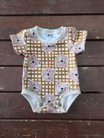 This bodysuit is lovingly made from cotton lycra Fabric which has been digitally printed. Our bodysuits can be made with different length sleeves so please send us a message if you would like something different from what is listed. Please note that pattern placement will be different and unique in each bodysuit. The crotch is closed with snaps for easy nappy changes and high quality ribbing is used for the cuffs/leg/neck bands. Currently in stock and ready to post.